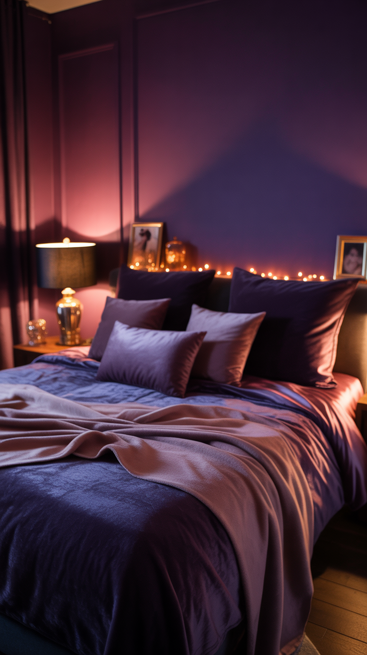 The subtle floral accents add a touch of nature, enhancing the romantic vibe. Candles flicker softly, casting a warm glow that makes the space feel even more enchanting. The combination of dark and light purples creates depth, making the room feel layered and rich.