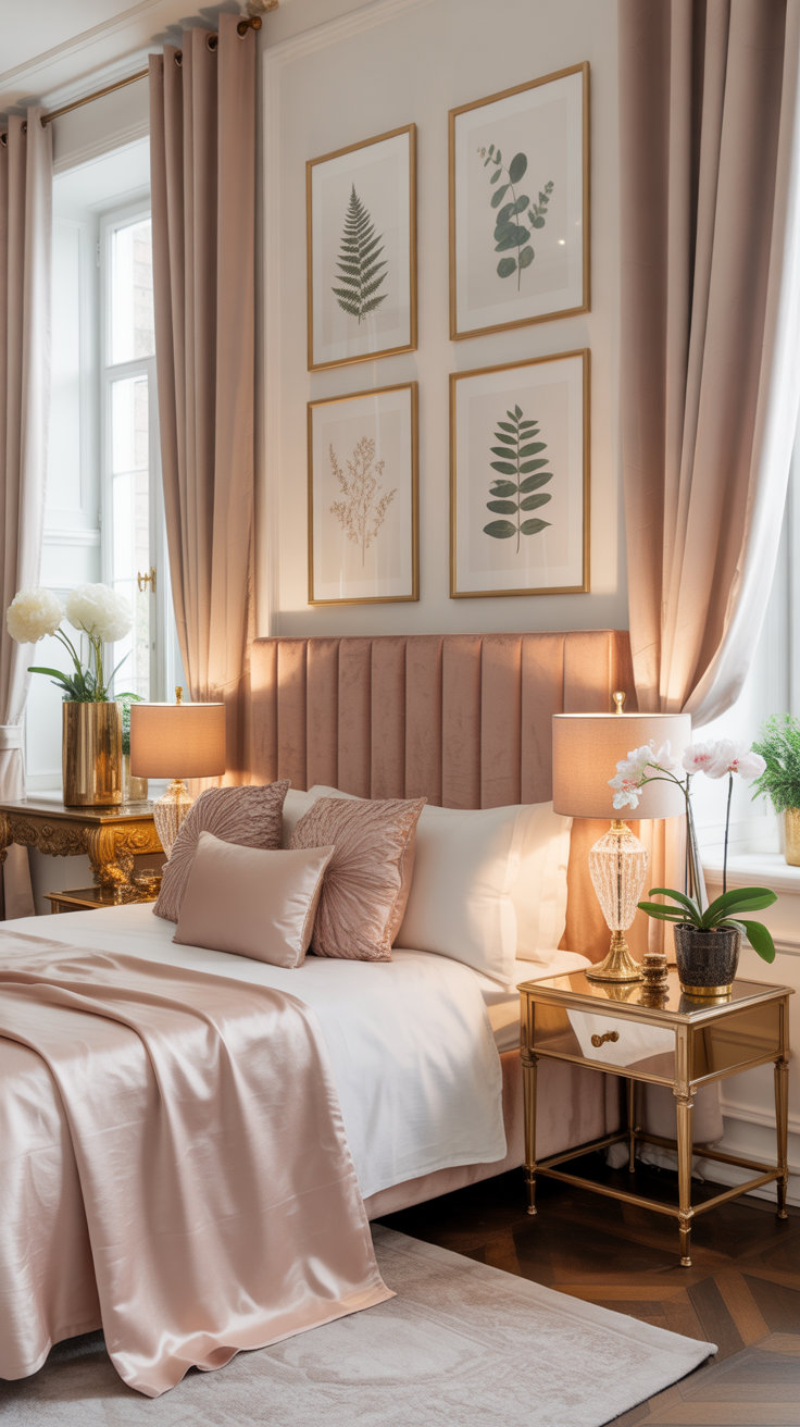 The image showcases a room where blush tones dominate, creating a warm and inviting atmosphere. The gold elements, like the lamp and mirror frame, add a touch of glam without overwhelming the softness of the pink. This balance is key for a chic bedroom vibe.